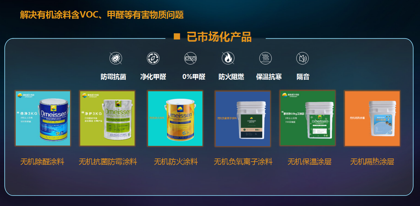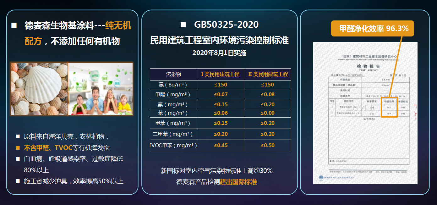 德麦森无机涂料是由生物基碳酸钙无机色素和无机矿物质色粉填料等,完全不同于传统墙面涂料使用化工原料、助剂进行加工生产;产品在生产过程中主要使用高温煅烧、高速共混的纯物理流程进行生产,因而不含甲醛/TVOC等有机挥发物,无毒,无味,无刺激性,对周边环境、居家环境和使用者、施工者均无害,其装修垃圾可以作为肥料回归自然,无二次污染问题。