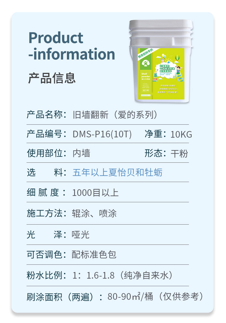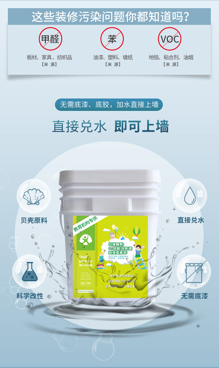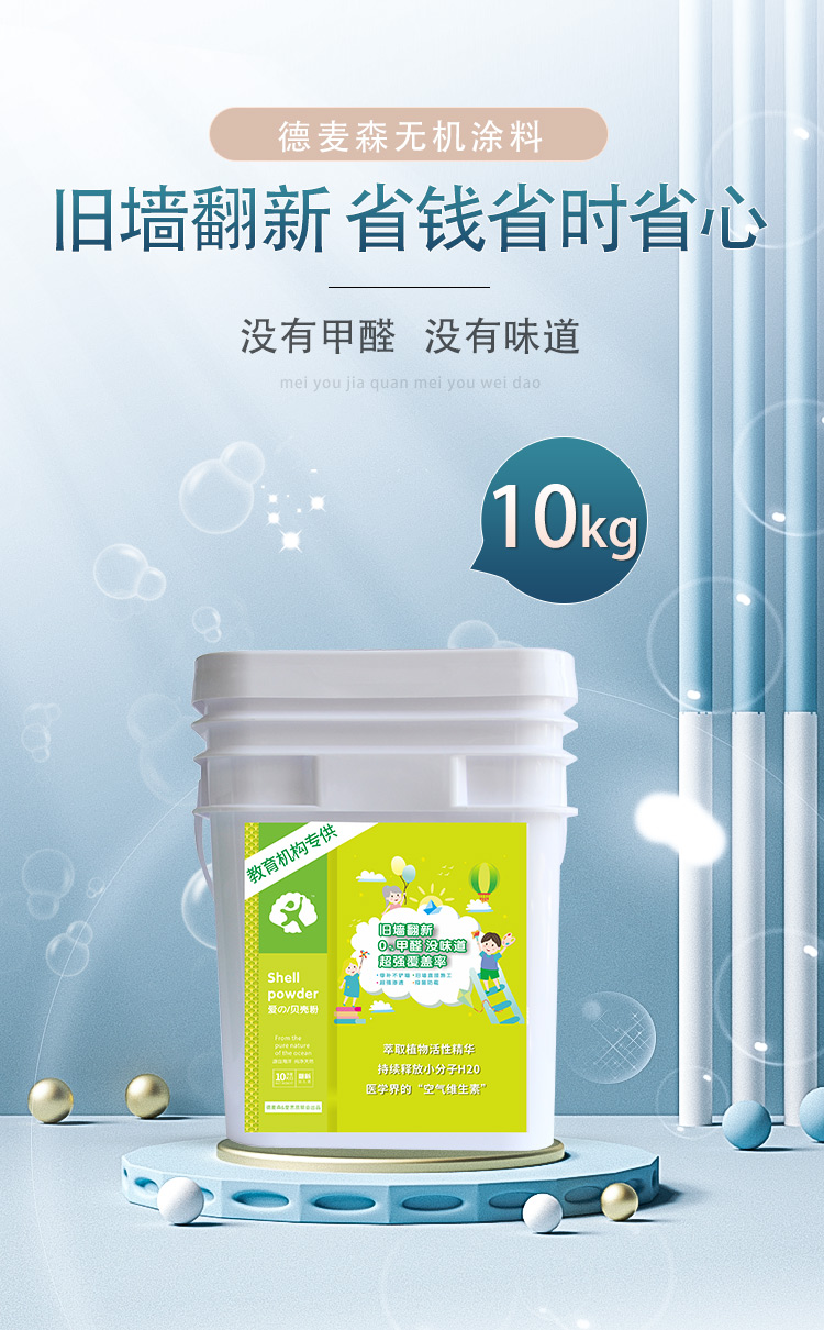 采用五年以上深海贝壳精制而成,产品拥有贝壳粉优异的环保功能和丰富的色彩,并且添加了超强渗透分子,快速破坏乳胶漆漆膜,无须铲墙,直接在旧墙上即可施工,减少时间和费用成本,产品各项指标全部达到国家标准,是新一代无机健康环保内墙涂料。