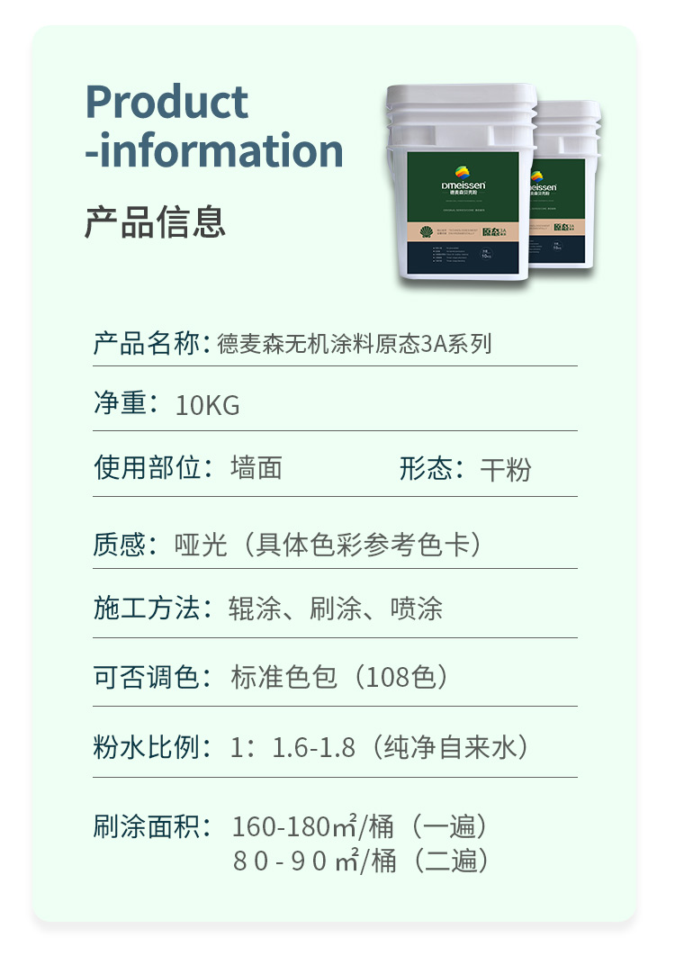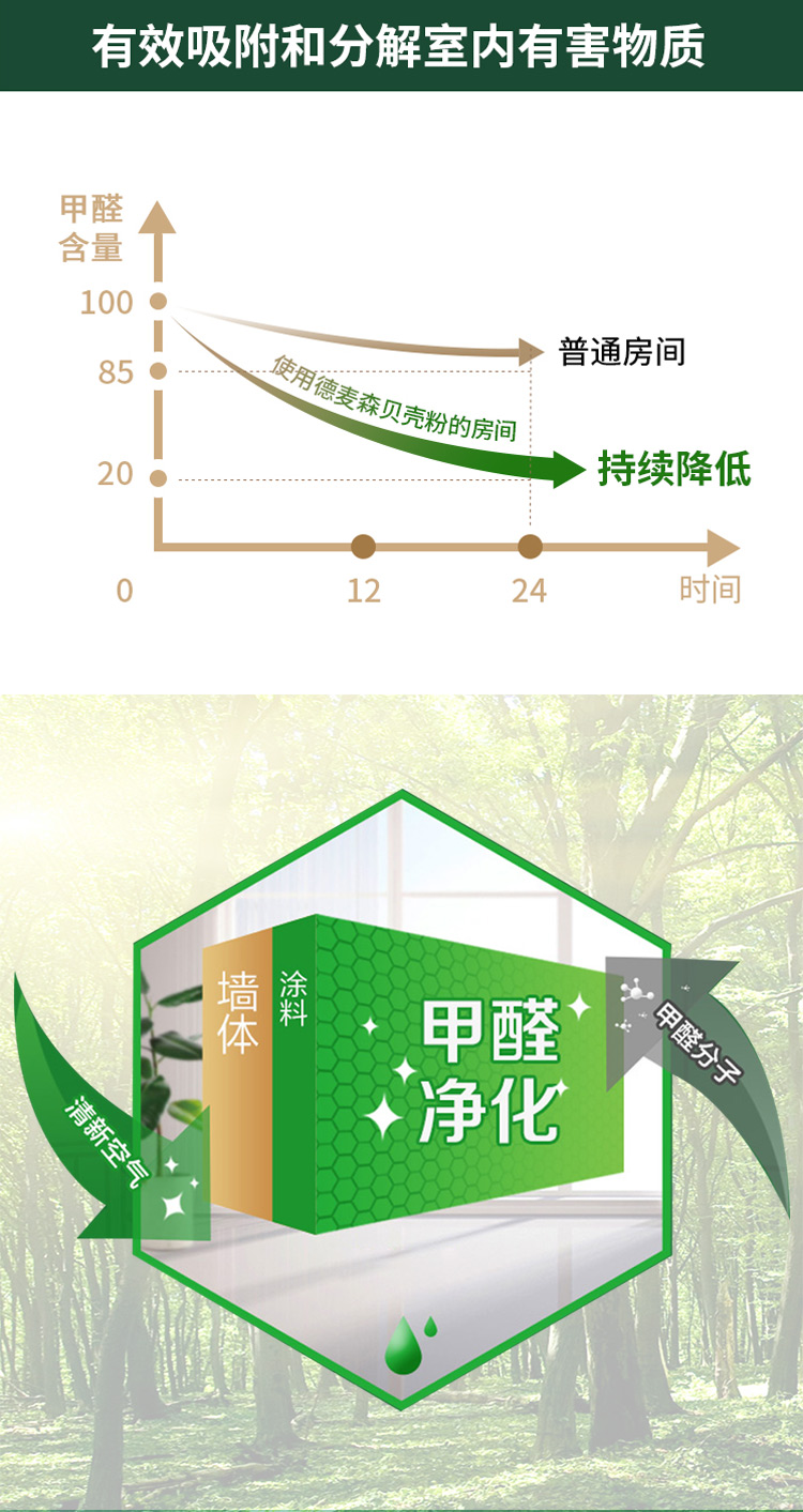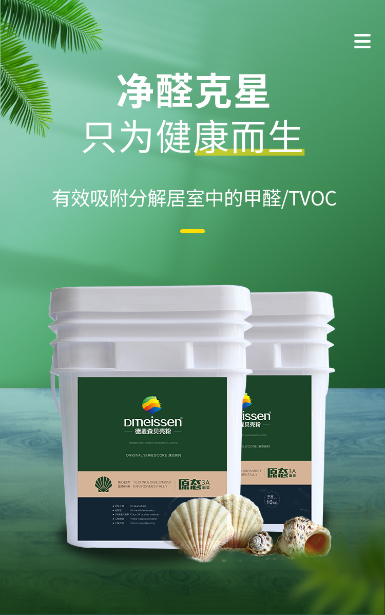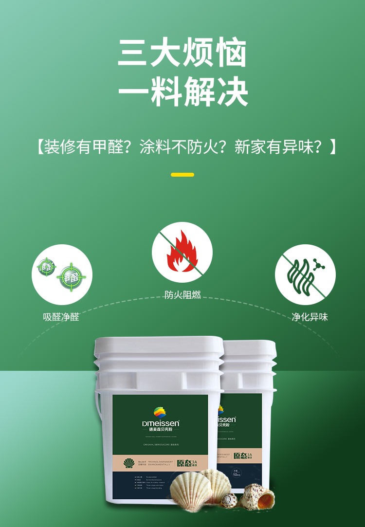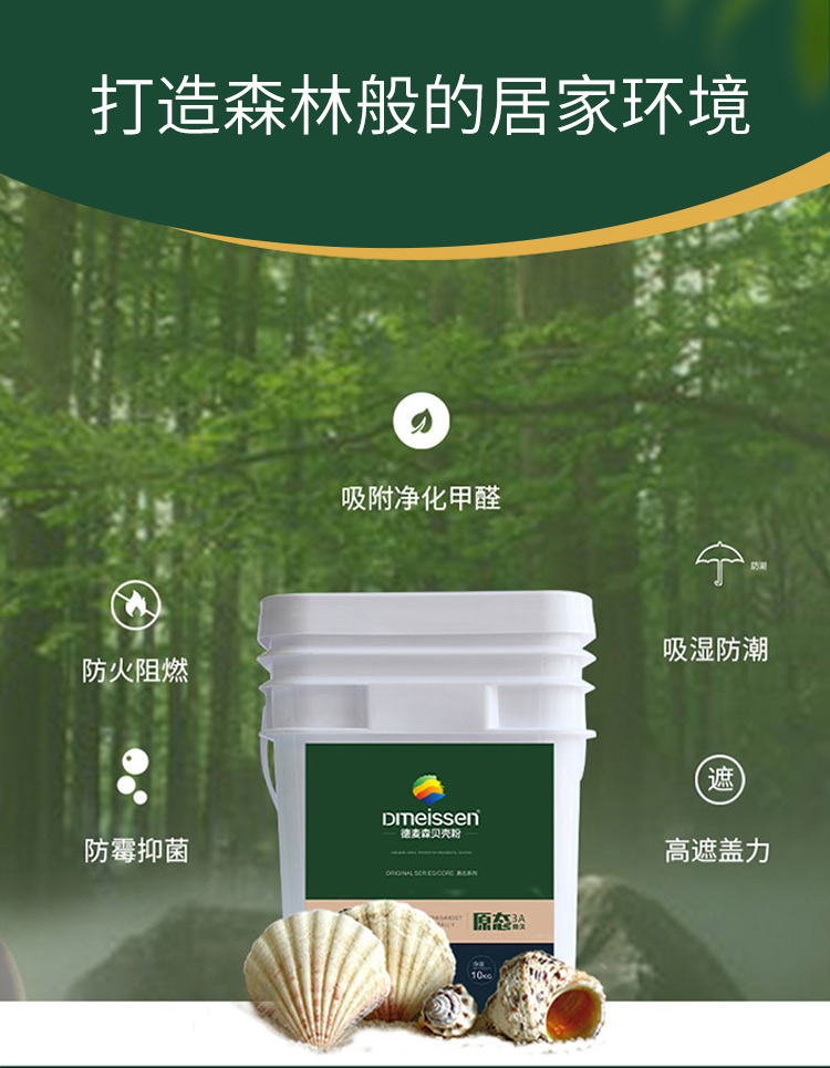 德麦森原态系列无机涂料产品精选深海8年以上4A级(直径12CM以上)成熟扇贝,采用生物酶去残留、三级煅烧、三级高温高速共混等核心技术加工而成,实现了无胶上墙的至高环保要求,保持了贝壳粉原有的吸附净化、吸湿防潮、抑菌杀菌、防火阻燃等特性,是德麦森核心技术和至高环保理念的代表之作。