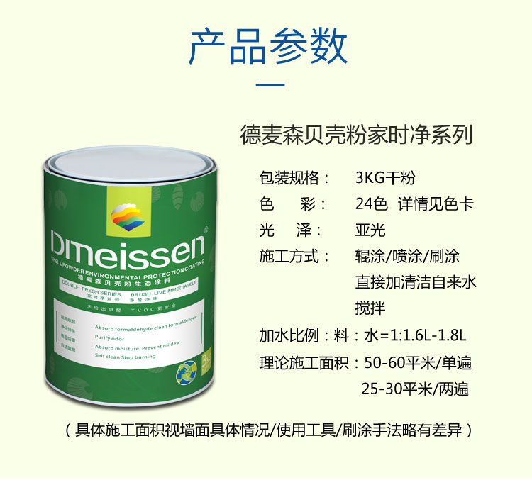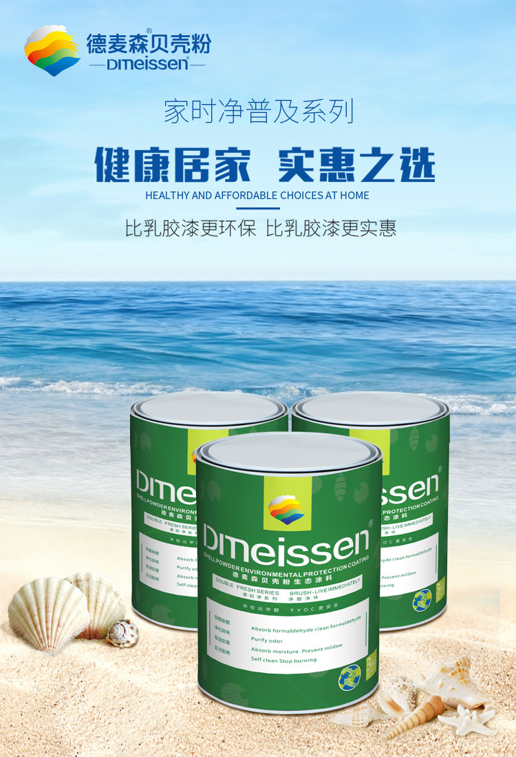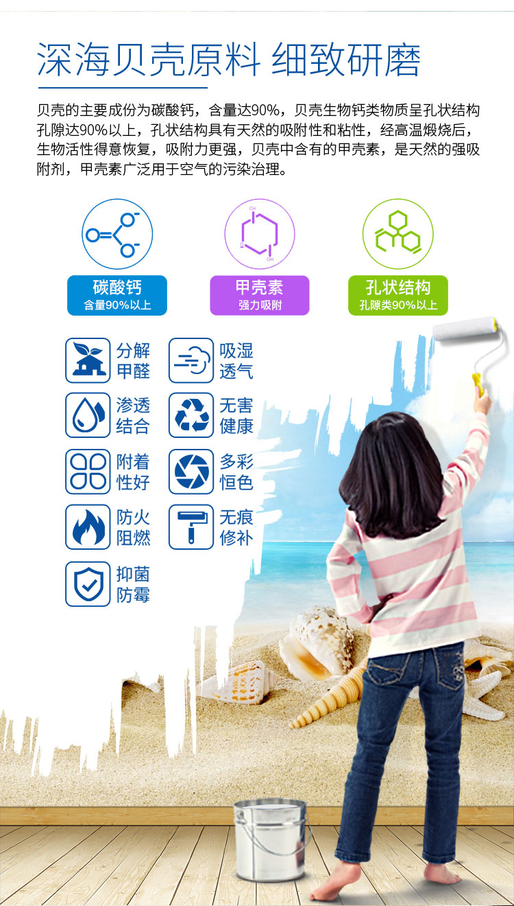 产品采用深海三年以成熟A类贝壳,经过清洗、研磨、高温煅烧等二十一道工序生产而成,产品未检出甲醛、TVOC等有害物质,生产过程中不添加任何化工原料,施工过程直接兑水即可使用,具有不掉粉、不褪色、遮盖率好、哑光、无污染等特点,色彩丰富,可像 乳胶漆一样施工。各项指标全部达到国家标准,是新一代无机健康环保内墙涂料。