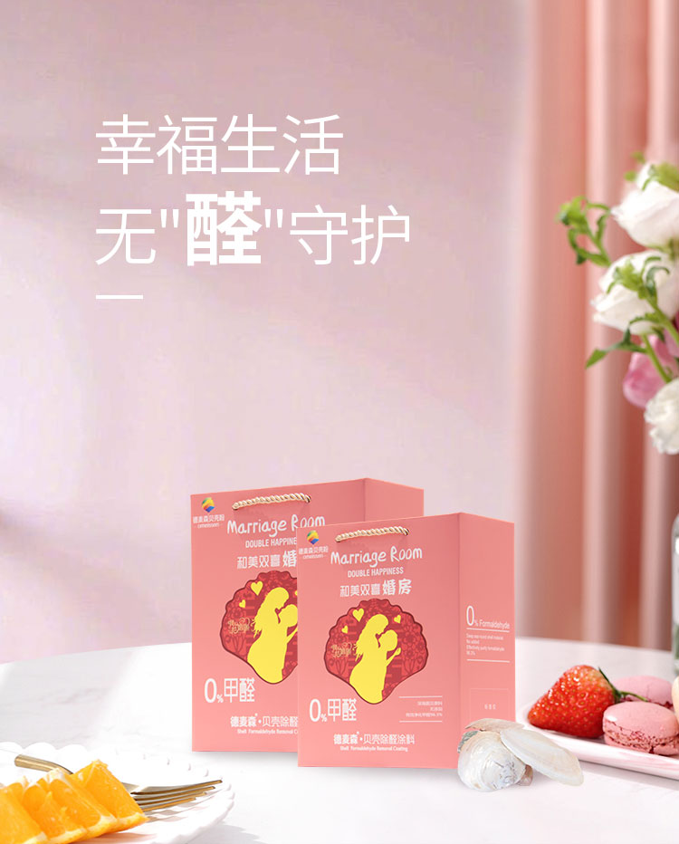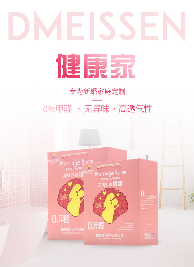 德麦森和美双喜婚房专用系列产品,精选深海10年以上成熟圆贝加工而成,在保证产品至高环保品质的同时,寓意对每对新婚夫妇美好的祝福;产品采用生物酶去残留、三级煅烧、三级高温高速共混等核心技术加工而成,无任何有害化学添加,为每对新婚夫妻提供真正健康安全的新房环境。产品可以直接在乳胶漆旧墙上覆盖,节省施工时间,在保持产品净醛除味性能的同时,具有优良的吸湿透气、防潮防霉效果。