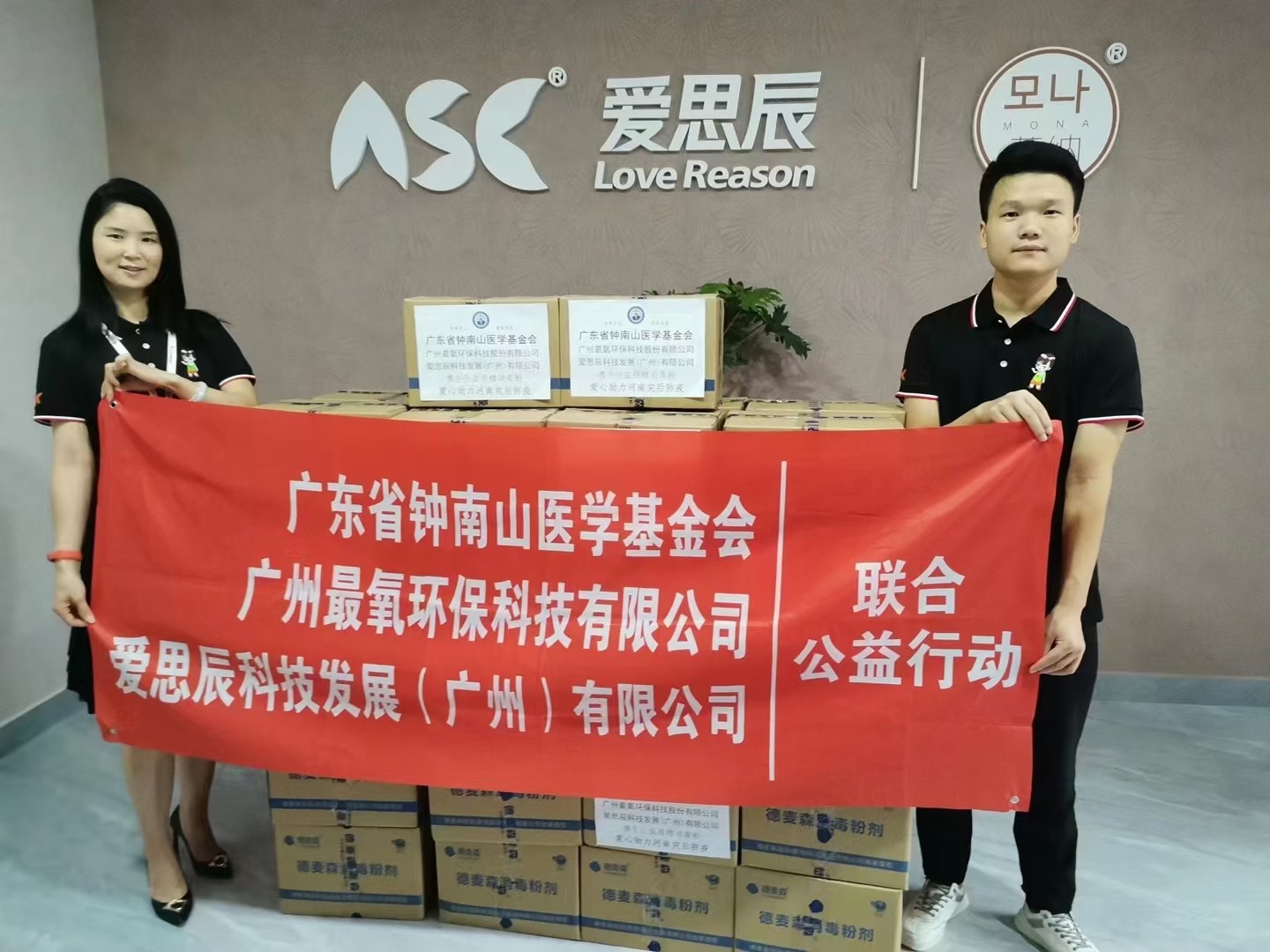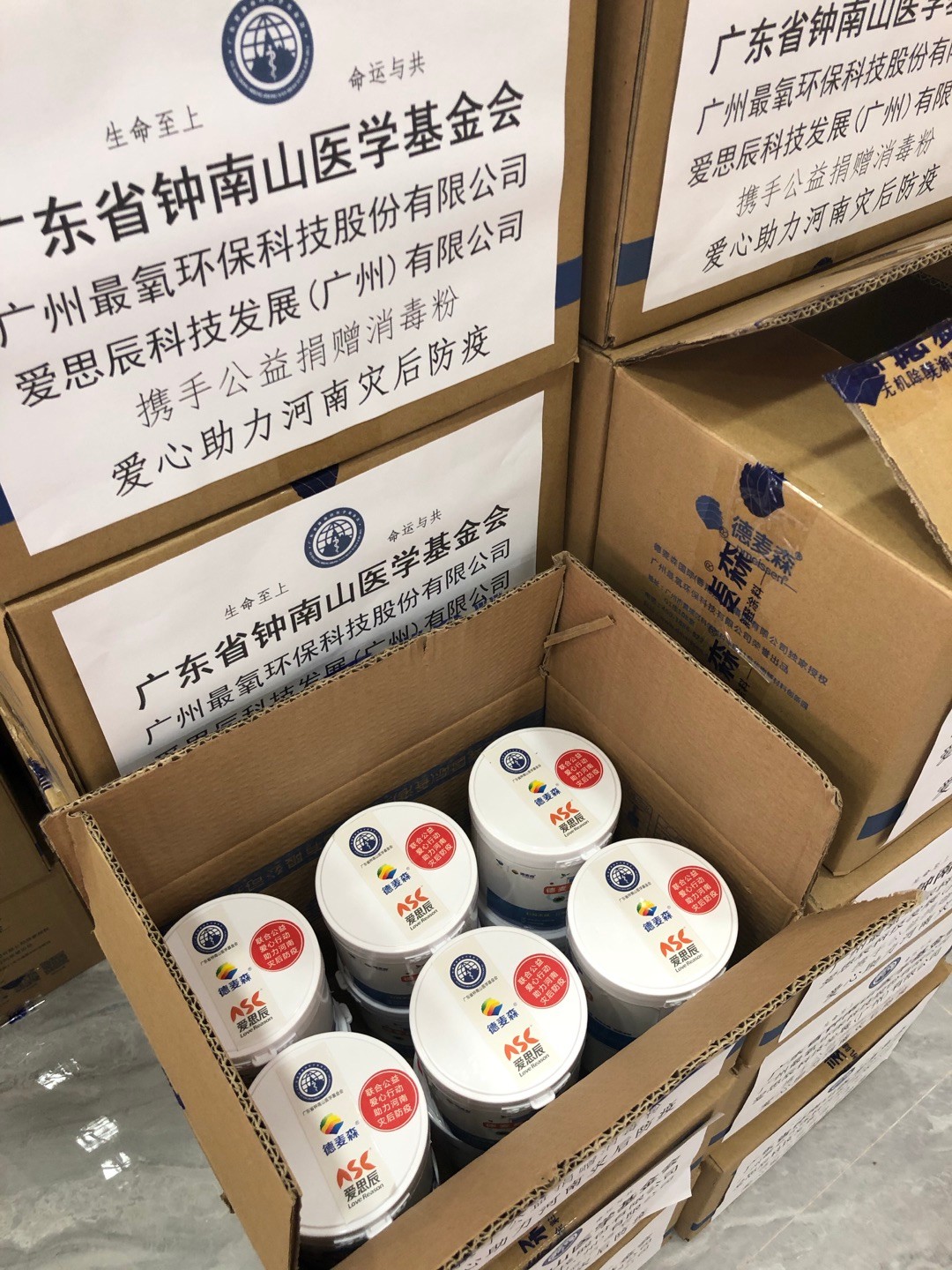 广东省钟南山医学基金会,广州最氧环保科技股份有限公司,爱思辰科技发展(广州)有限公司联合公益行动捐赠消毒粉,首站河南濮阳站捐赠进行中。