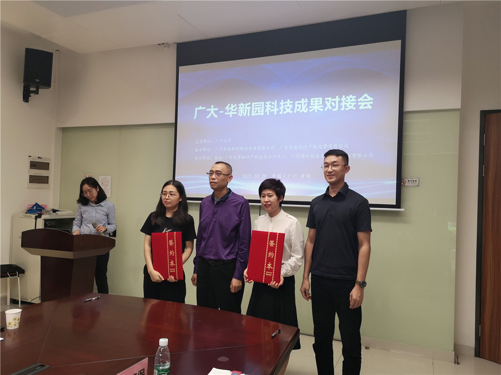 2021年10月29日 ,广州大学&华新园开展了科技成果对接会。会议开展前广州大学领导进行了致辞后,不同项目研究的老师进行了路演,同时广州大学与广州最氧环保科技股份有限公司进行项目签约仪式。在本次活动中,参会各方代表就各自感兴趣的项目进行了深入交流,集聚企业生产研发中遇到共性技术问题和专业技术难题探讨,促进产学研合作与科技成果的转化应用。