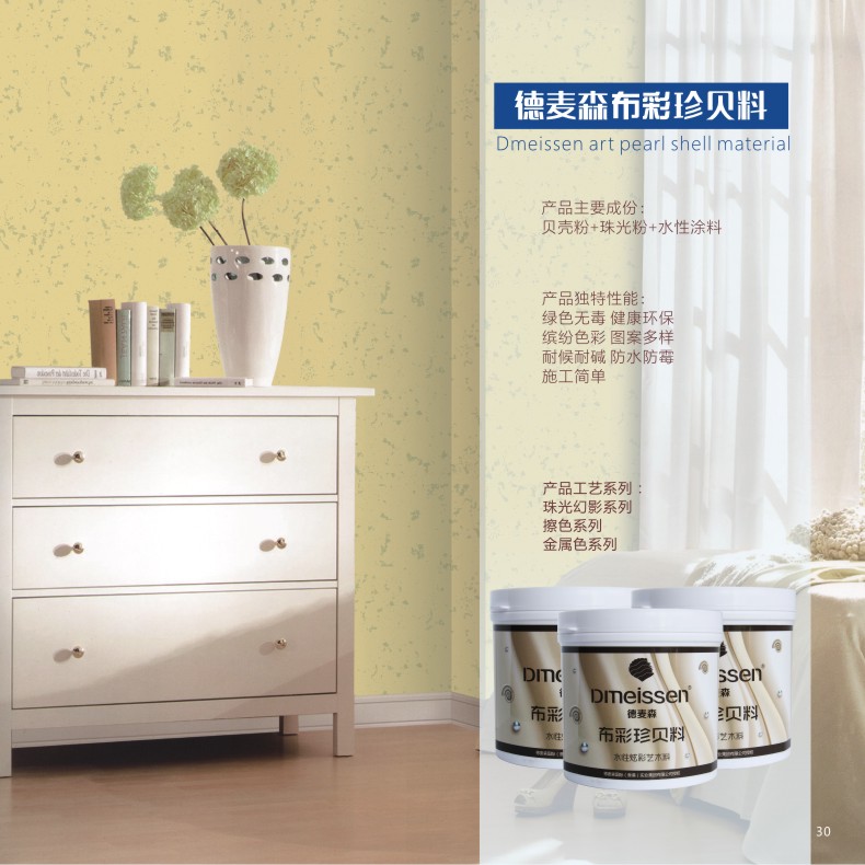 产品主要采用珠光粉+水性涂料组成,工艺以贝壳粉涂料为底,在此基础上通过点涂或擦涂工具进行施工,形成艺术墙面效果;墙面在不同的灯光下或不同的视线角度会呈现出不同的光泽度,呈现出美仑美奂的艺术效果,让墙面变得更有艺术感和个性。