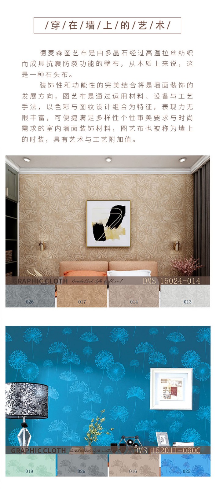 是当下欧洲最流的墙面装修材料,产品采用德国进口原材料,德国生产线加工而成,采用欧洲当下最流行的花色款式,是内墙装饰领域装饰性和功能性最完全的墙面材料产品,融合了墙纸和涂料的特点,被誉为”穿在墙上的艺术品“;产品具有采用石英石高温精炼成丝,辅以植物纤维编织而成,底层细腻,表层花纹立体感强,植物纤维不掉色、不掉毛,天然无毒,吸湿透气,防裂防翘,反复刷涂10次以上,花纹立体感仍然存在。与德麦森无机涂料相结合,更突出产品吸湿透气、防霉等独特优势。