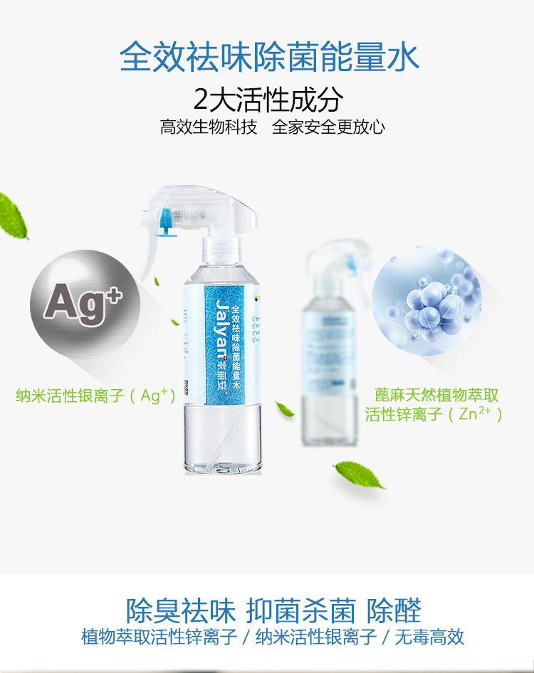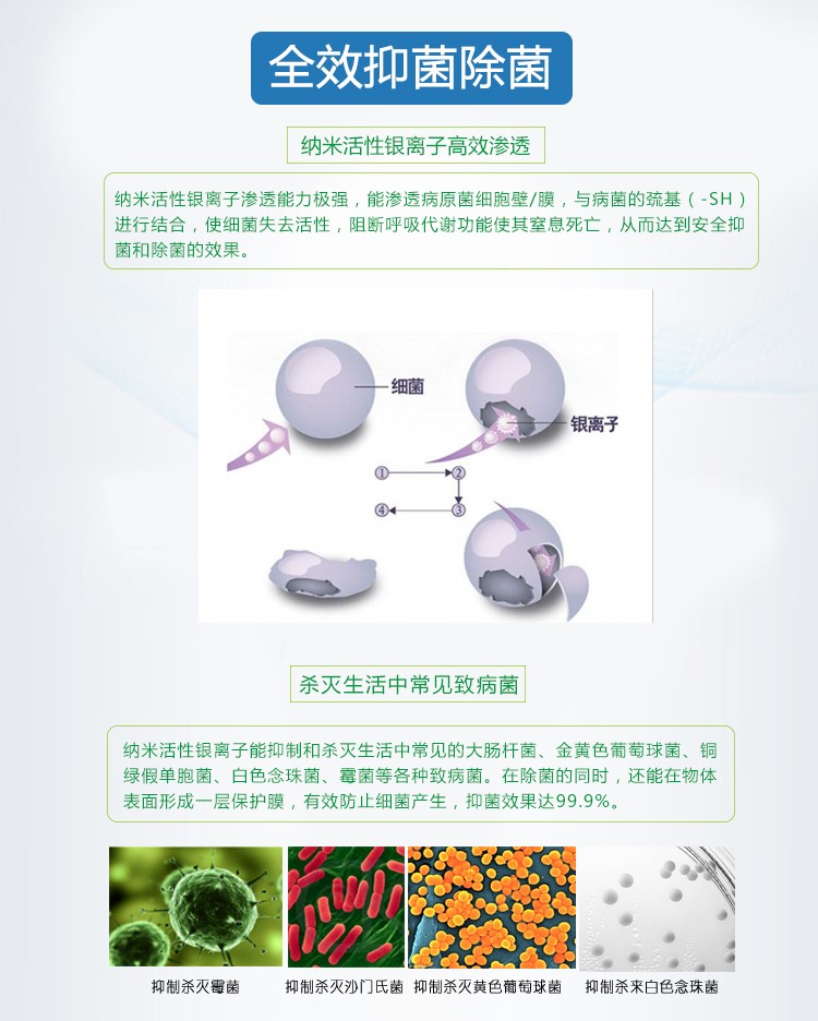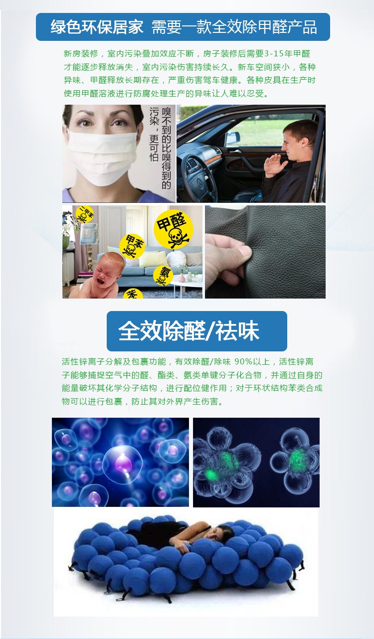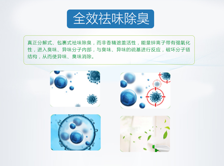 本产品由巴西亚马逊流域出产的顶级蓖麻油中萃取天然活性锌离子,能有效分解各种硫化物(臭鸡蛋)、胺类化合物(肉类)、氨类化合物产生的各种臭味、异味;同时,添加纳米活性银离子,有效抑制、杀灭大肠杆菌、黄色葡萄球菌、沙门氏菌、霉菌、白色念珠菌等各种有害细菌,是一款全效型的天然防护剂。