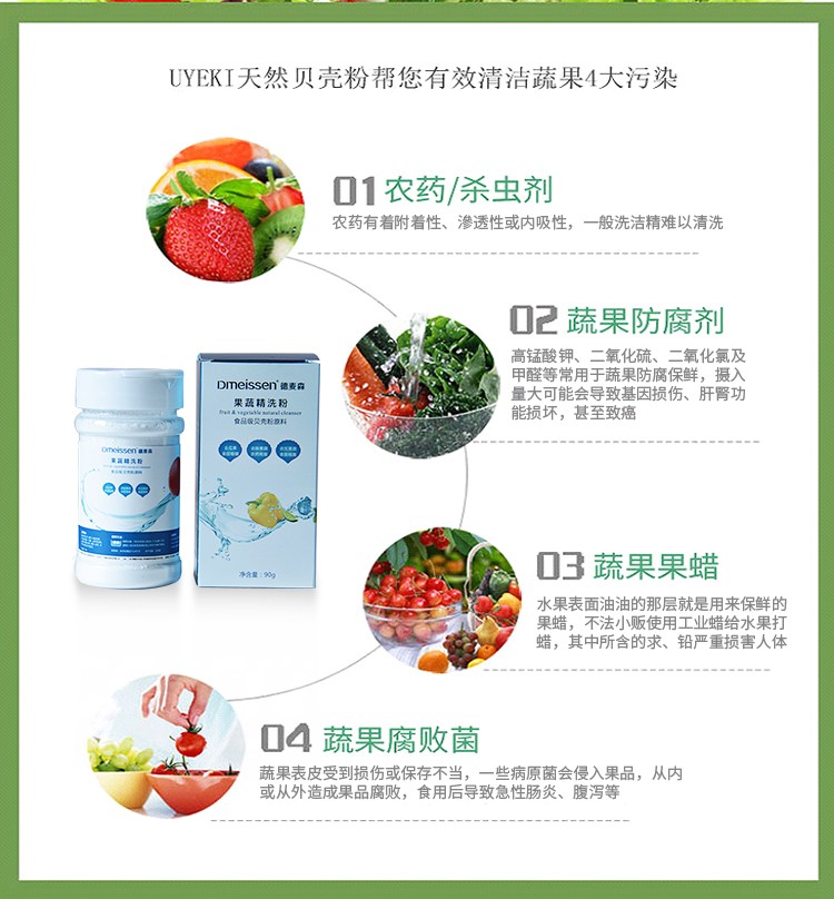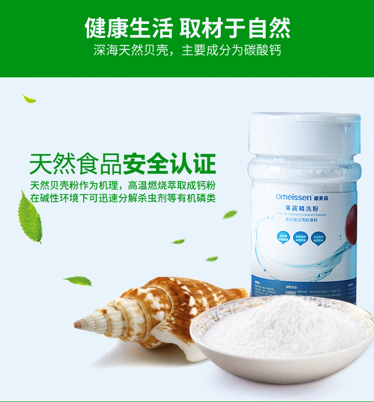 德麦森贝壳果蔬精洗粉采用深海砗磲原料高温煅烧提炼而成,产品质地细腻洁白(细腻度:1200目以上),纯度高-贝壳粉含量99.999%以上,不添加任何化学成份,无毒无害,不刺激,广泛用于水果、肉类、鱼肉表面去残留、杀菌、保鲜作用;具有分解果蔬表面农药残留、杀灭细菌等功效。