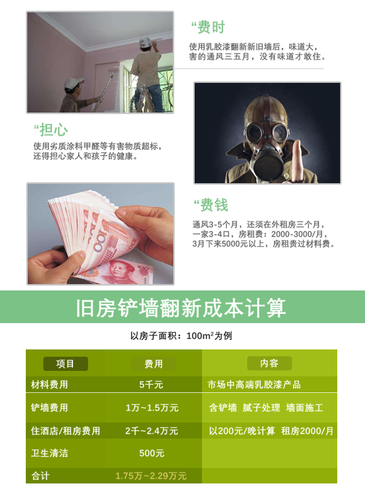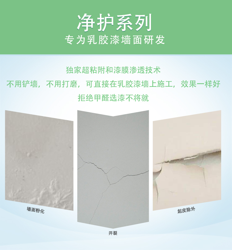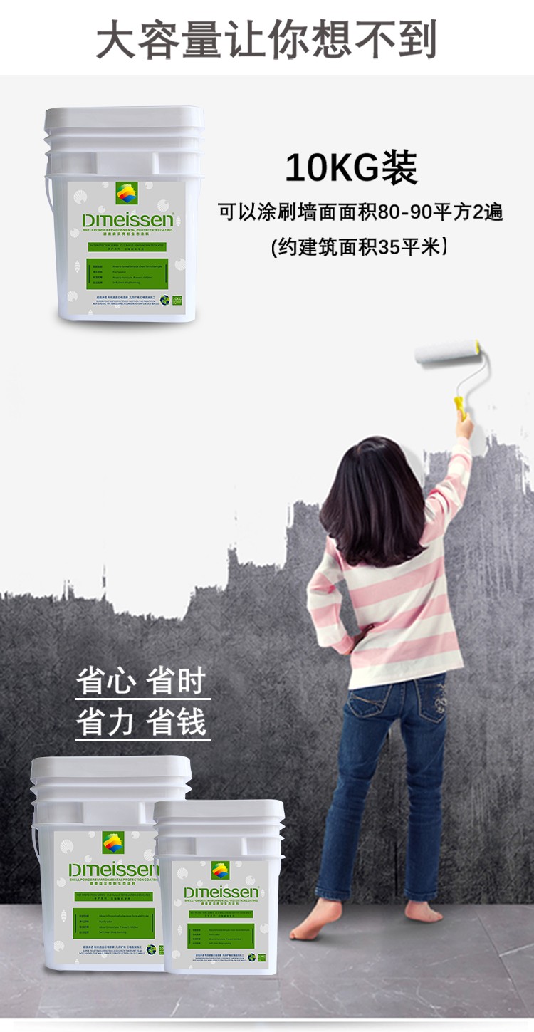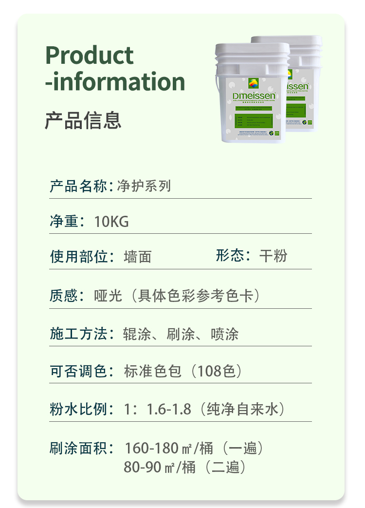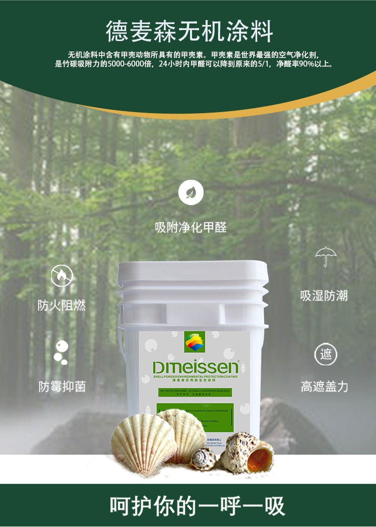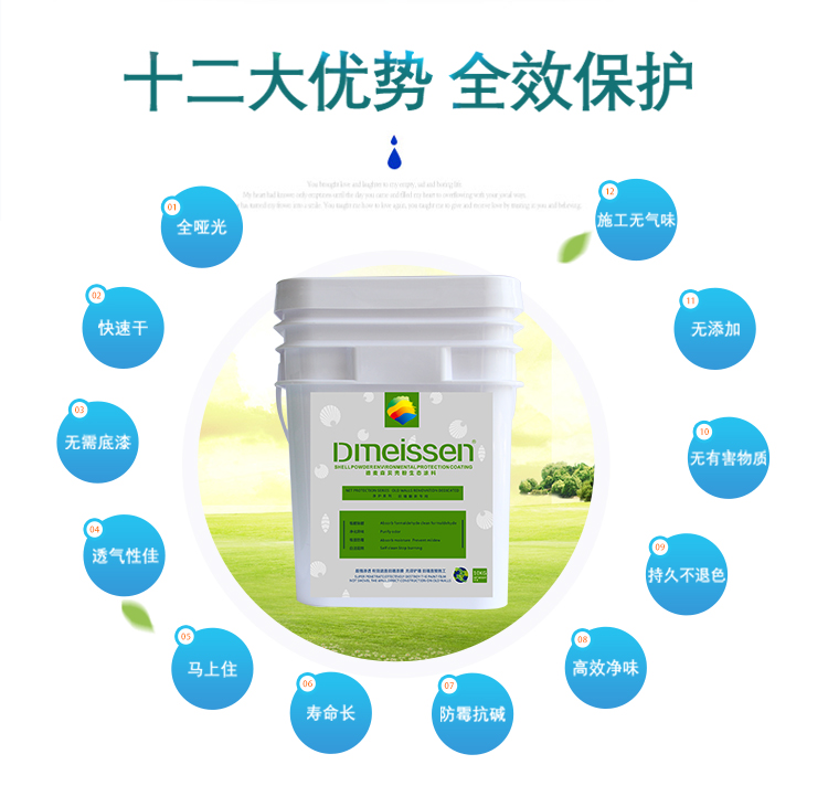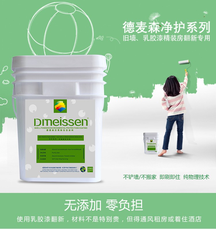 德麦森二手房翻新专用净护系列-采用五年以上深海贝壳精制而成,产品拥有贝壳粉优异的环保功能和丰富的色彩,并且添加了超强渗透分子,快速破坏乳胶漆漆膜,无须铲墙,直接在旧墙上即可施工,减少时间和费用成本,产品各项指标全部达到国家标准,是新一代无机健康环保内墙涂料。